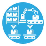 Manufacturing warehouses use robotic automation to transport materials between production and storage areas.